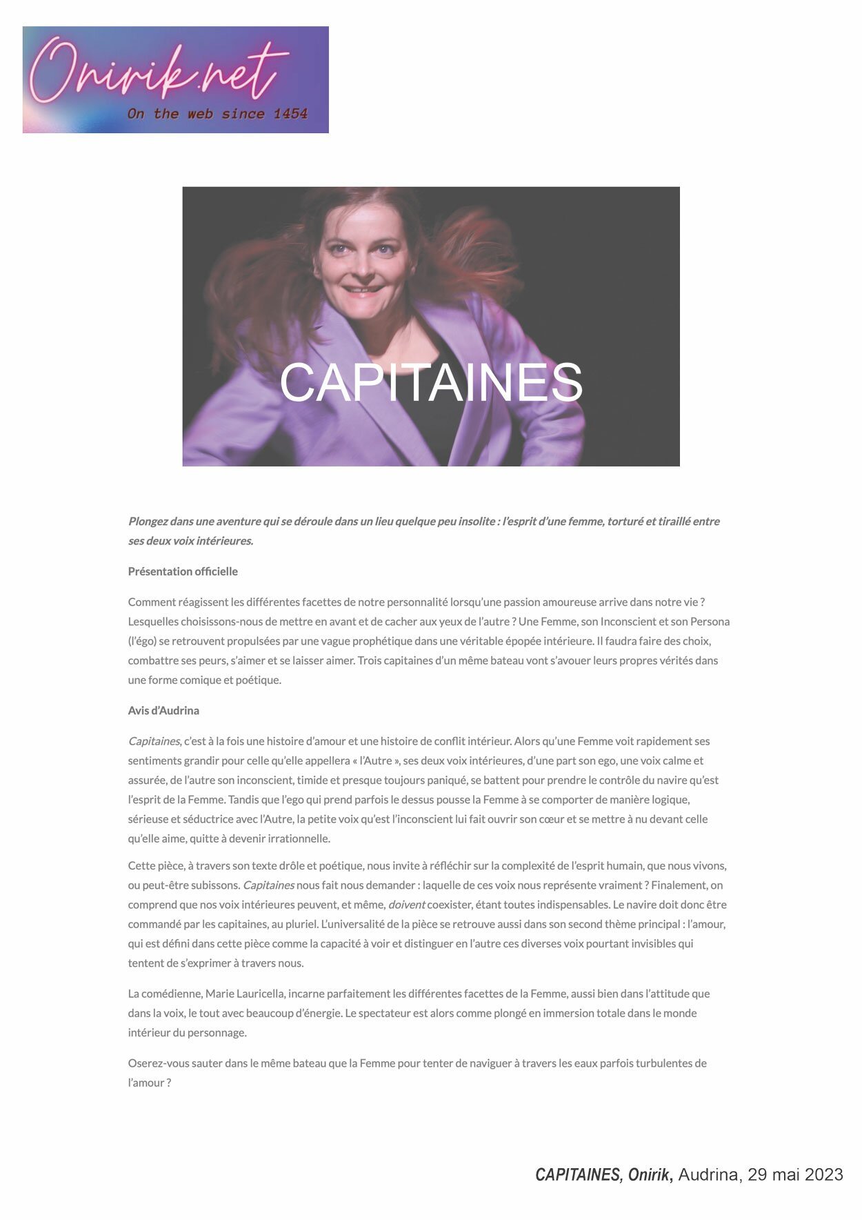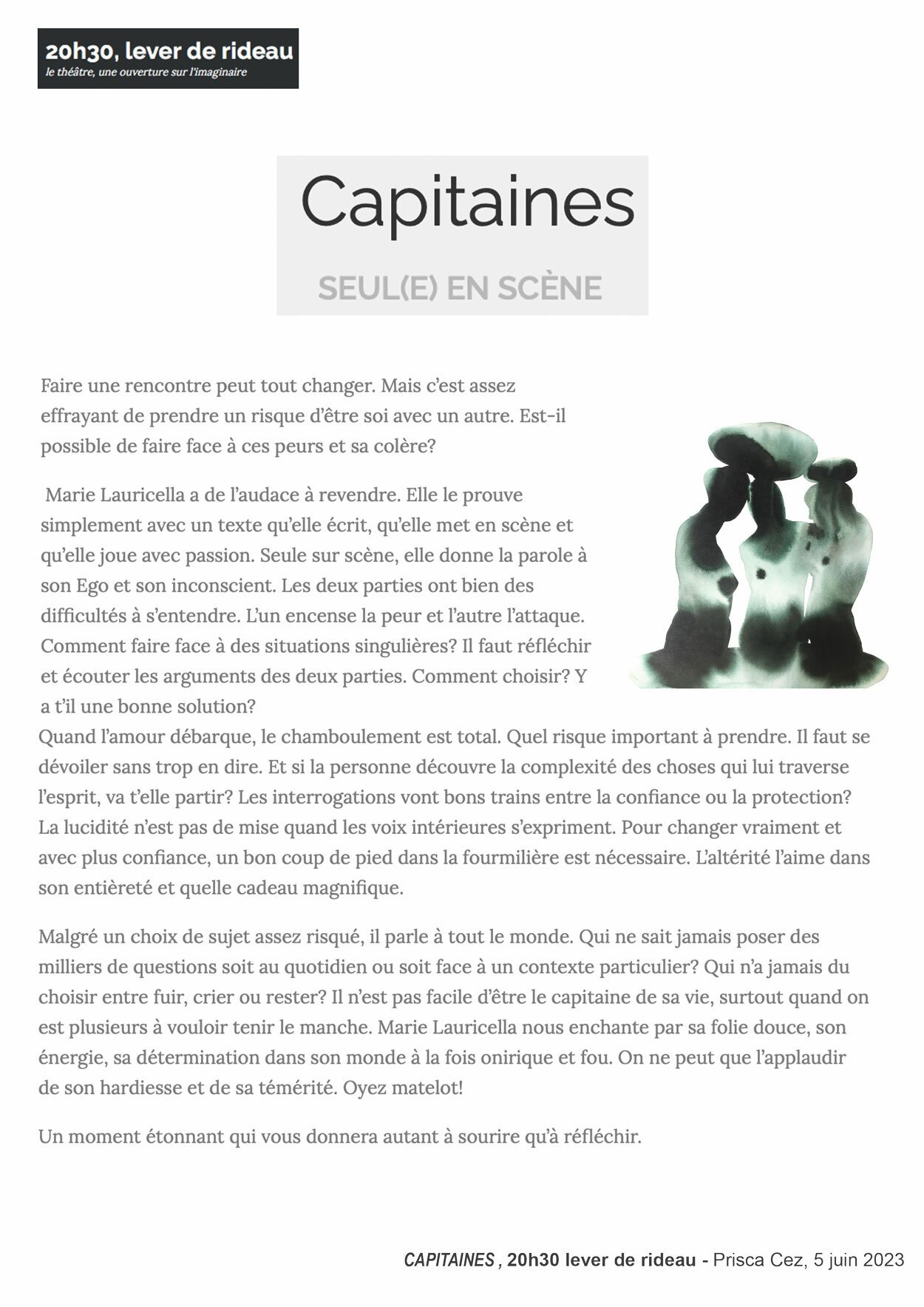 Marie Lauricella nous enchante par sa folie douce, son énergie, sa détermination dans son monde à la fois onirique et fou. On ne peut que l’applaudir de son hardiesse et de sa témérité. Oyez matelot ! 20H30, LEVER DE RIDEAU