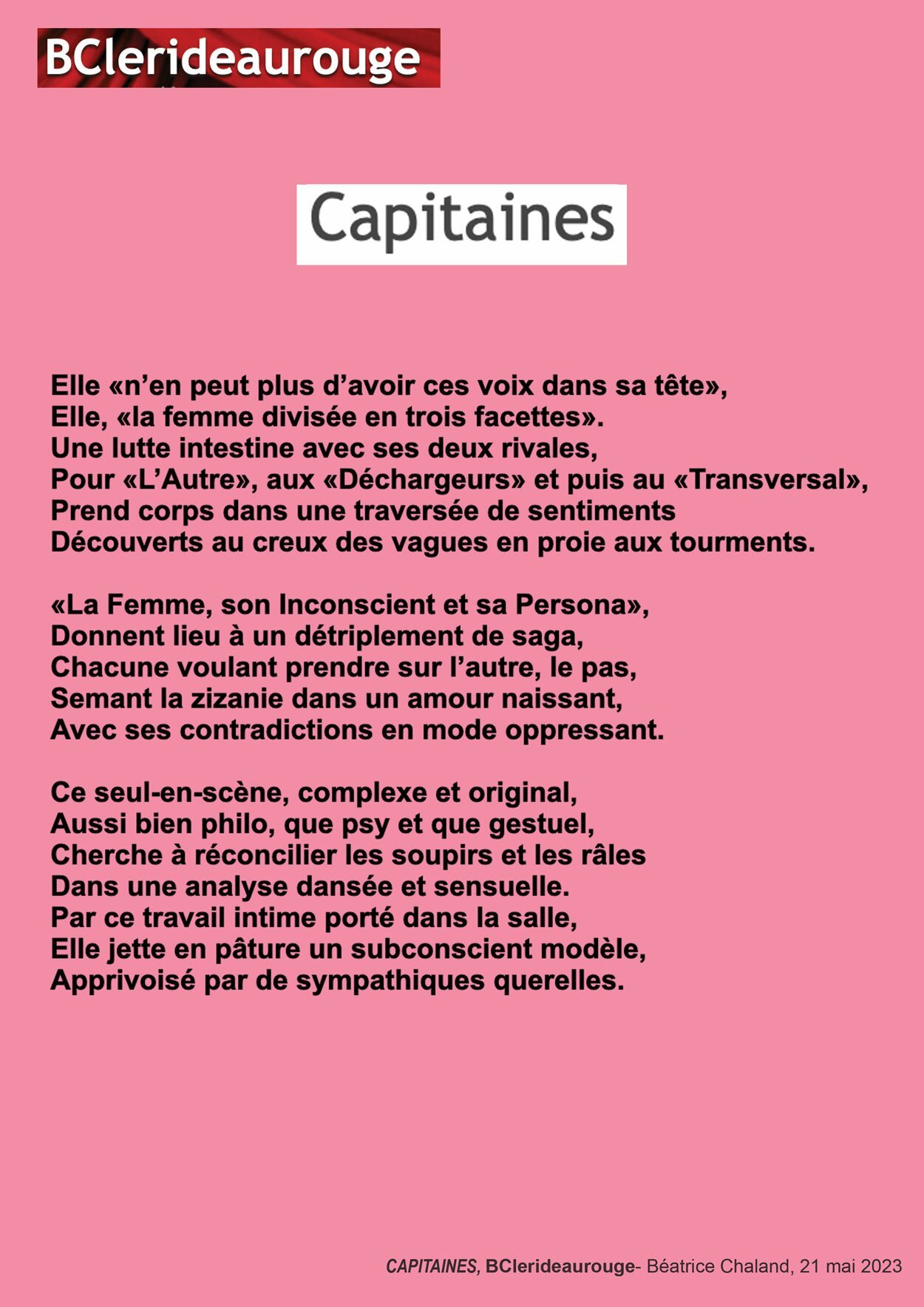 Ce seul-en-scène, complexe et original, Aussi bien philo, que psy et que gestuel, Cherche à réconcilier les soupirs et les râles Dans une analyse dansée et sensuelle. BCLERIDEAUROUGE