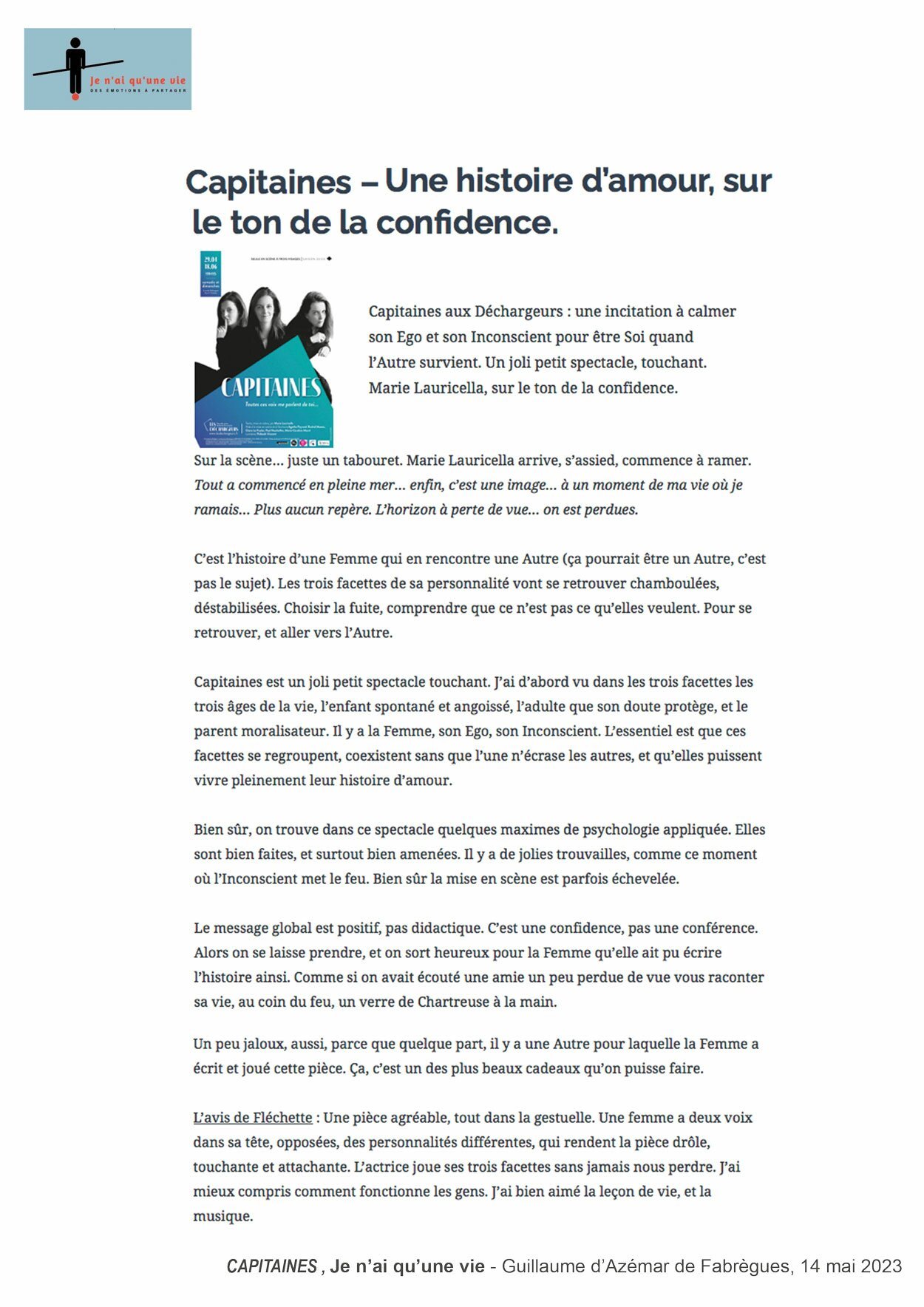 Une pièce drôle, touchante et attachante. On se laisse prendre, et on sort heureux. Un peu jaloux, aussi, parce que quelque part, il y a une Autre pour laquelle la Femme a écrit et joué cette pièce. Ça, c’est un des plus beaux cadeaux qu’on puisse faire. JE N’AI QU’UNE VIE