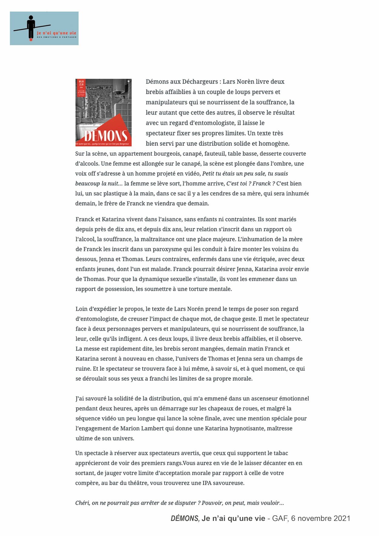 Un texte très bien servi par une distribution solide et homogène qui emmène dans un ascenseur émotionnel pendant deux heures. JE N’AI QU’UNE VIE