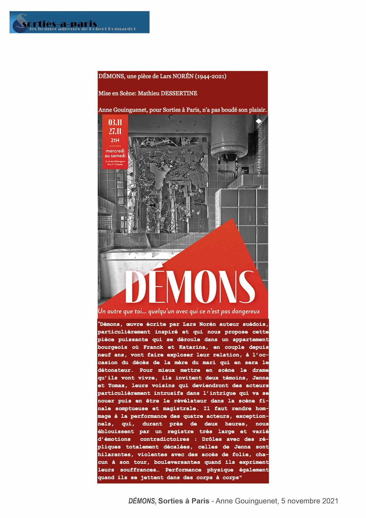 Il faut rendre hommage à la performance des quatre acteurs, exceptionnels, qui, durant près de deux heures, nous éblouissent par un registre très large et varié d’émotions contradictoires. SORTIES À PARIS