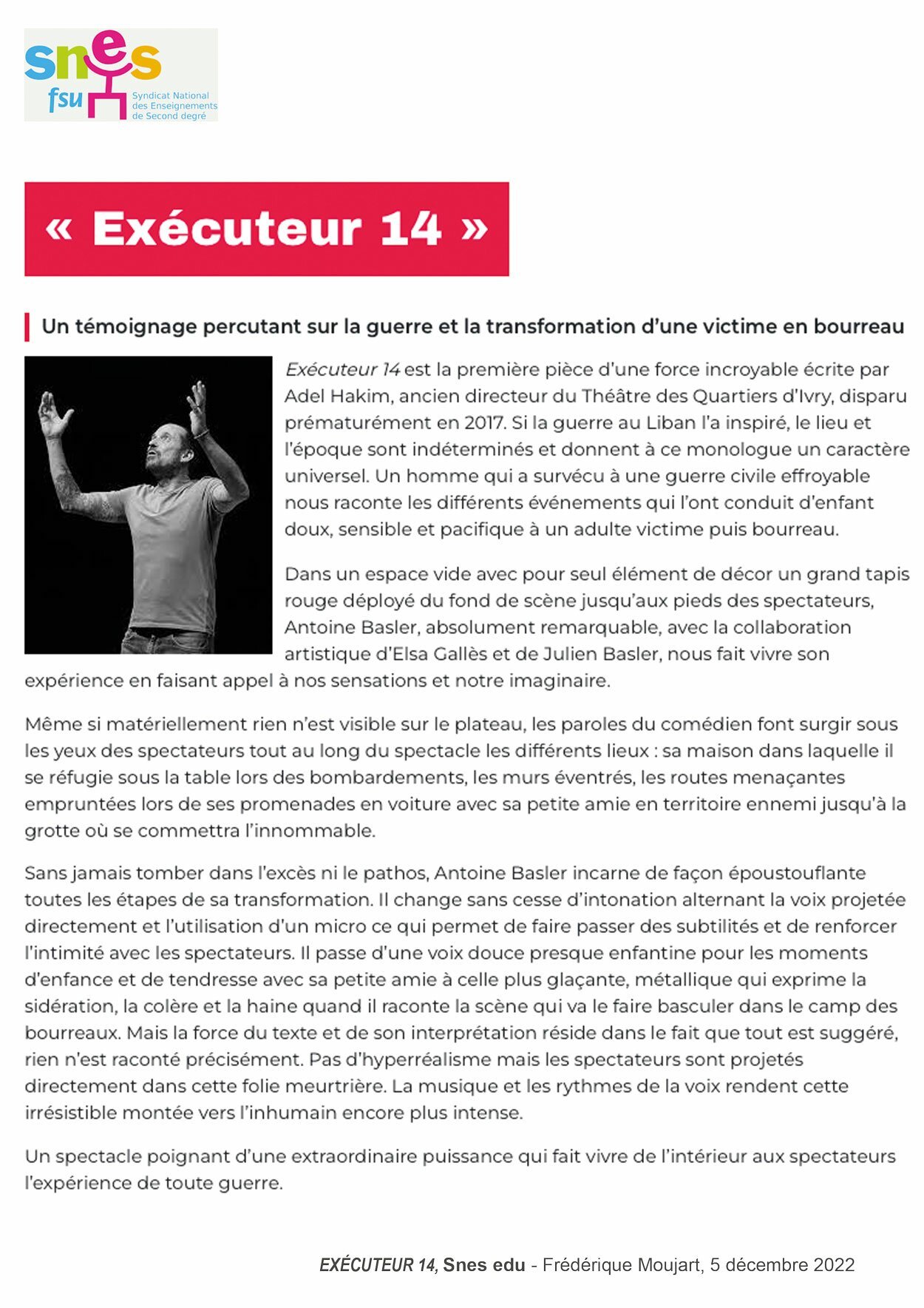 Un spectacle poignant d’une extraordinaire puissance qui fait vivre de l’intérieur aux spectateurs l’expérience de toute guerre. Antoine Basler est absolument remarquable. SNES EDU