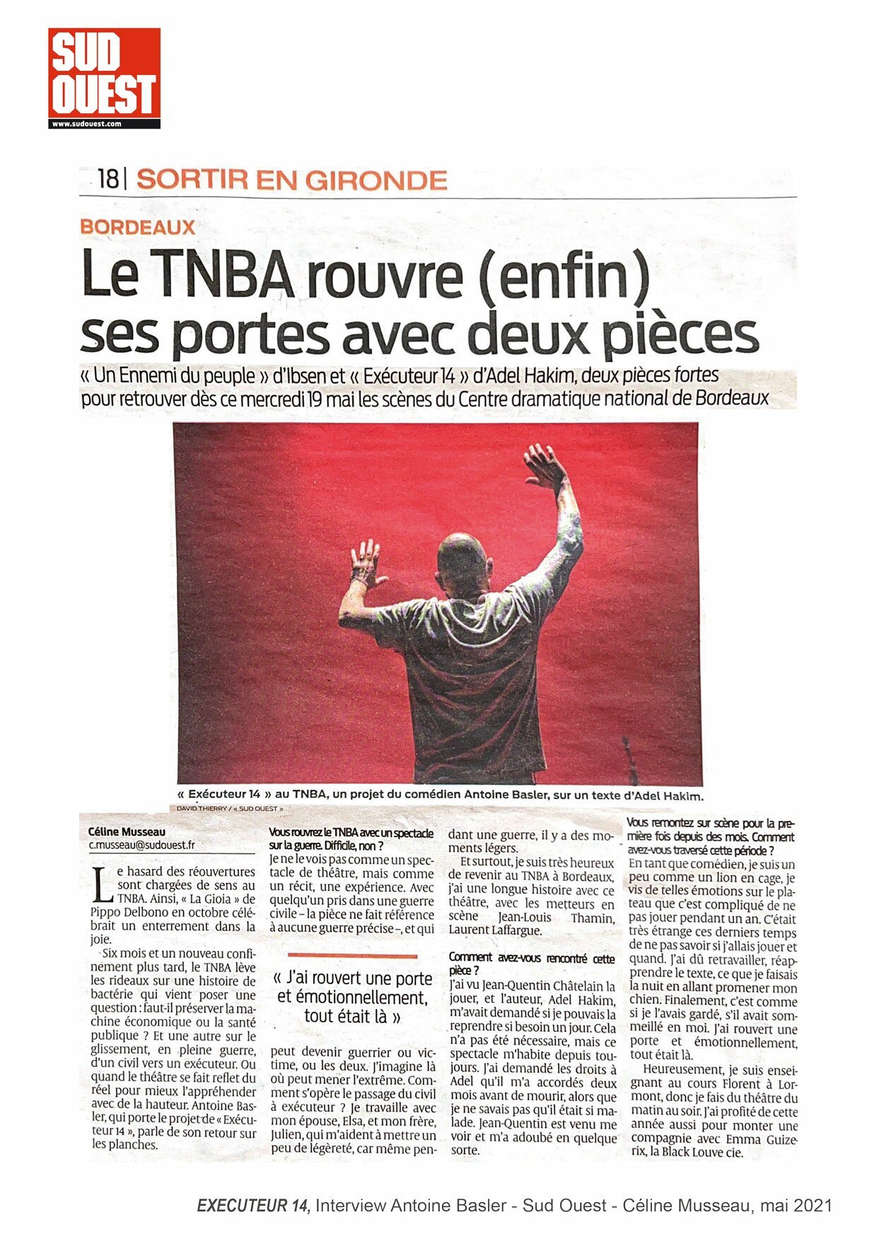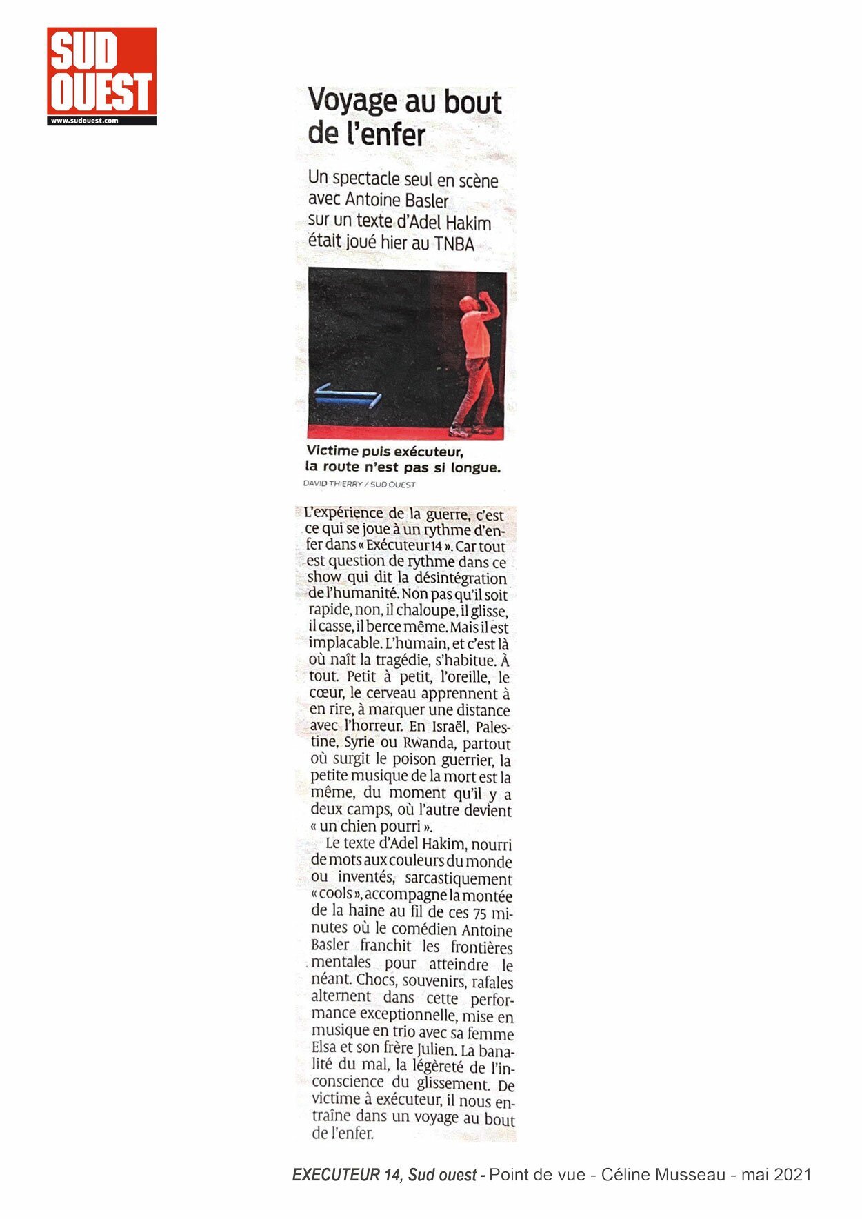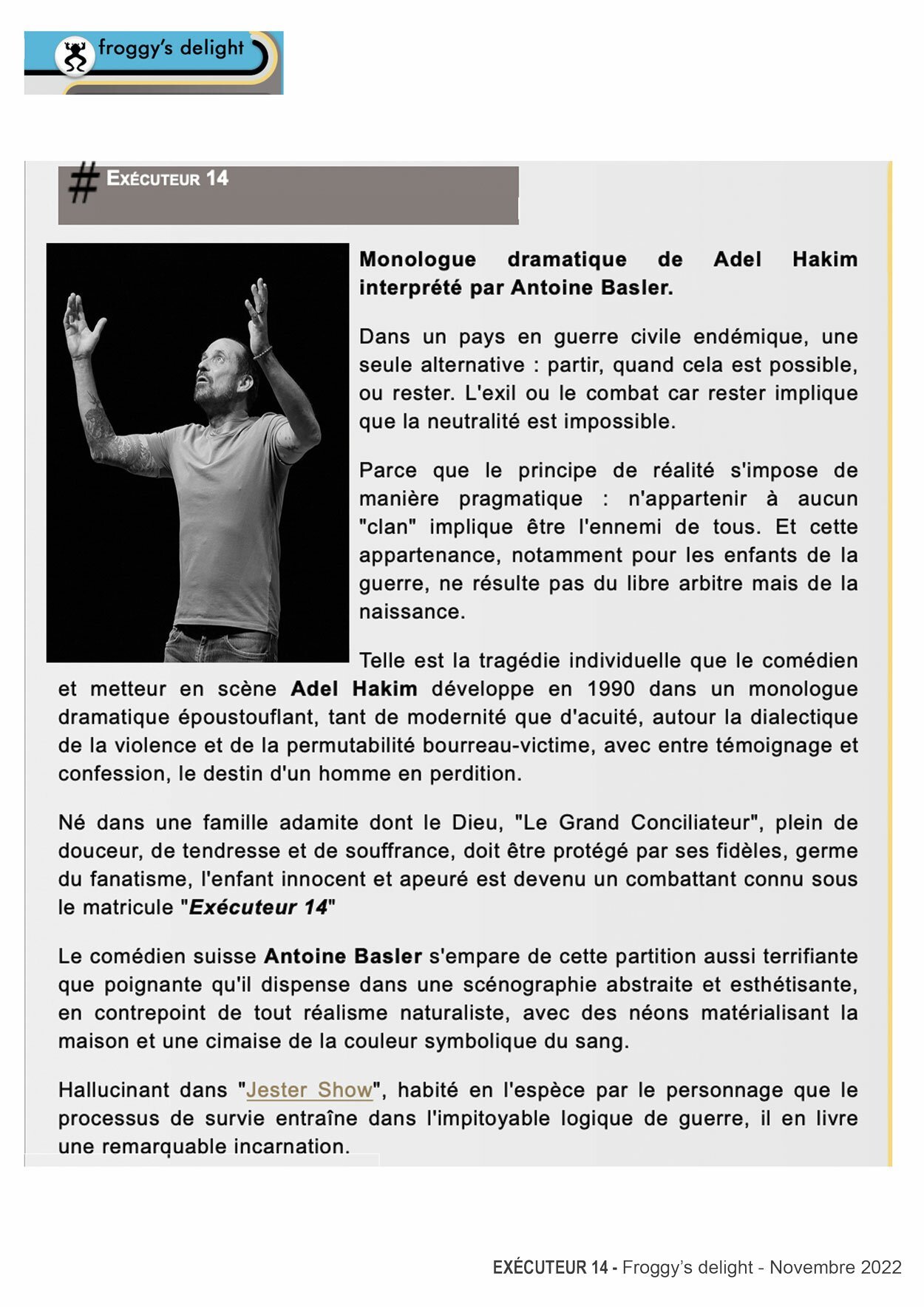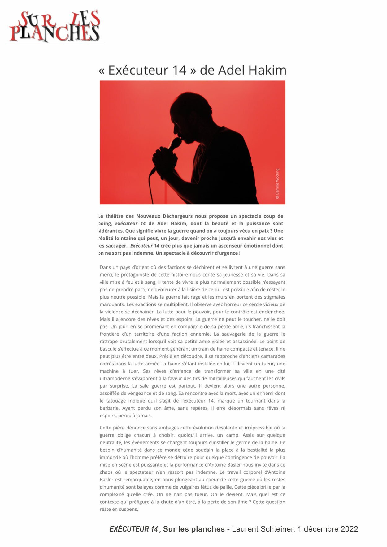 Non dénué d’élans poétiques, de tendresse parfois, Exécuteur 14 secoue nos consciences habituées à vivre le malheur d’autrui par procuration. Là, nous voici placés au cœur de la violence. Un spectacle nécessaire. LA GRANDE PARADE