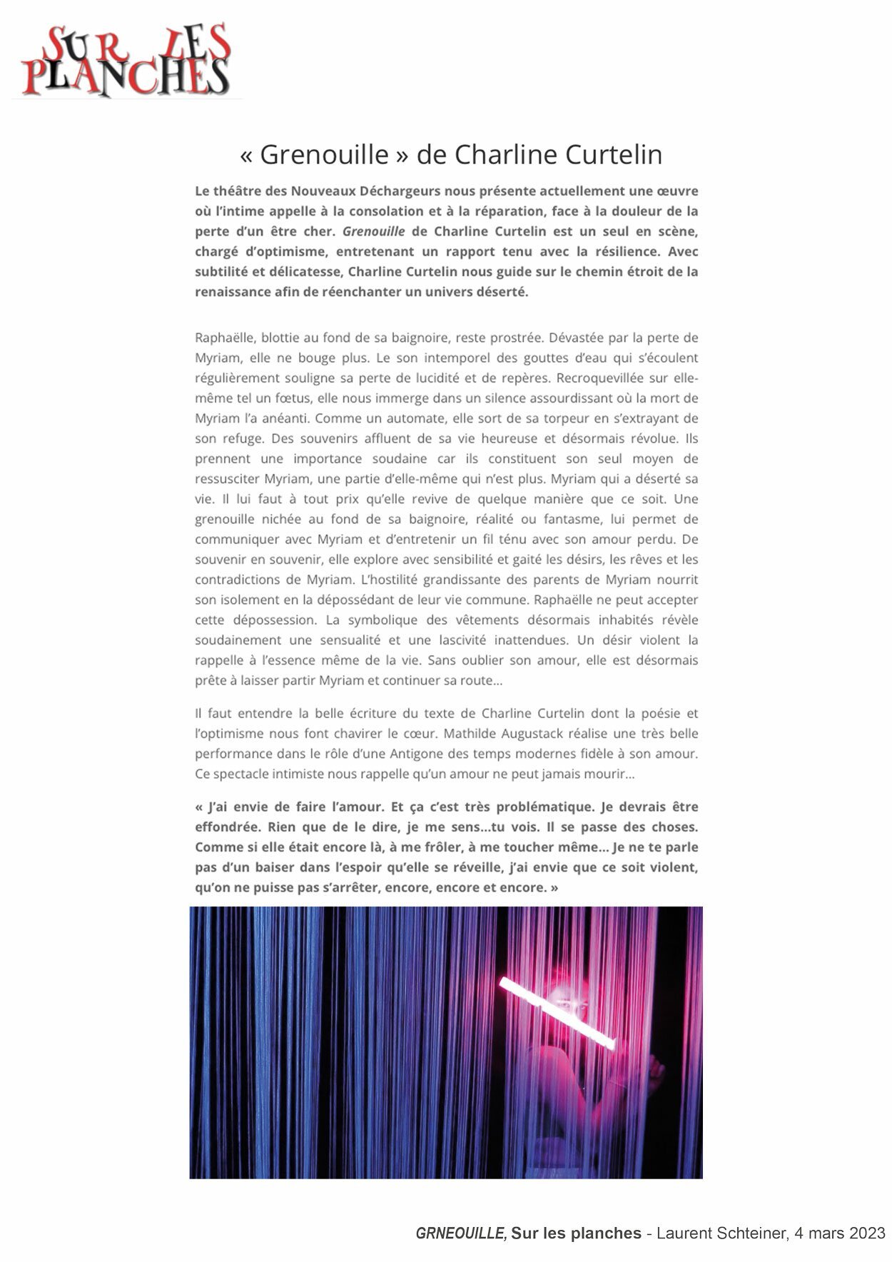 Il faut entendre la belle écriture du texte de Charline Curtelin dont la poésie et l’optimisme nous font chavirer le cœur. Avec subtilité et délicatesse, elle nous guide sur le chemin étroit de la renaissance afin de réenchanter un univers déserté. Mathilde Augustack réalise une très belle performance dans le rôle d’une Antigone des temps modernes fidèle à son amour. SUR LES PLANCHES