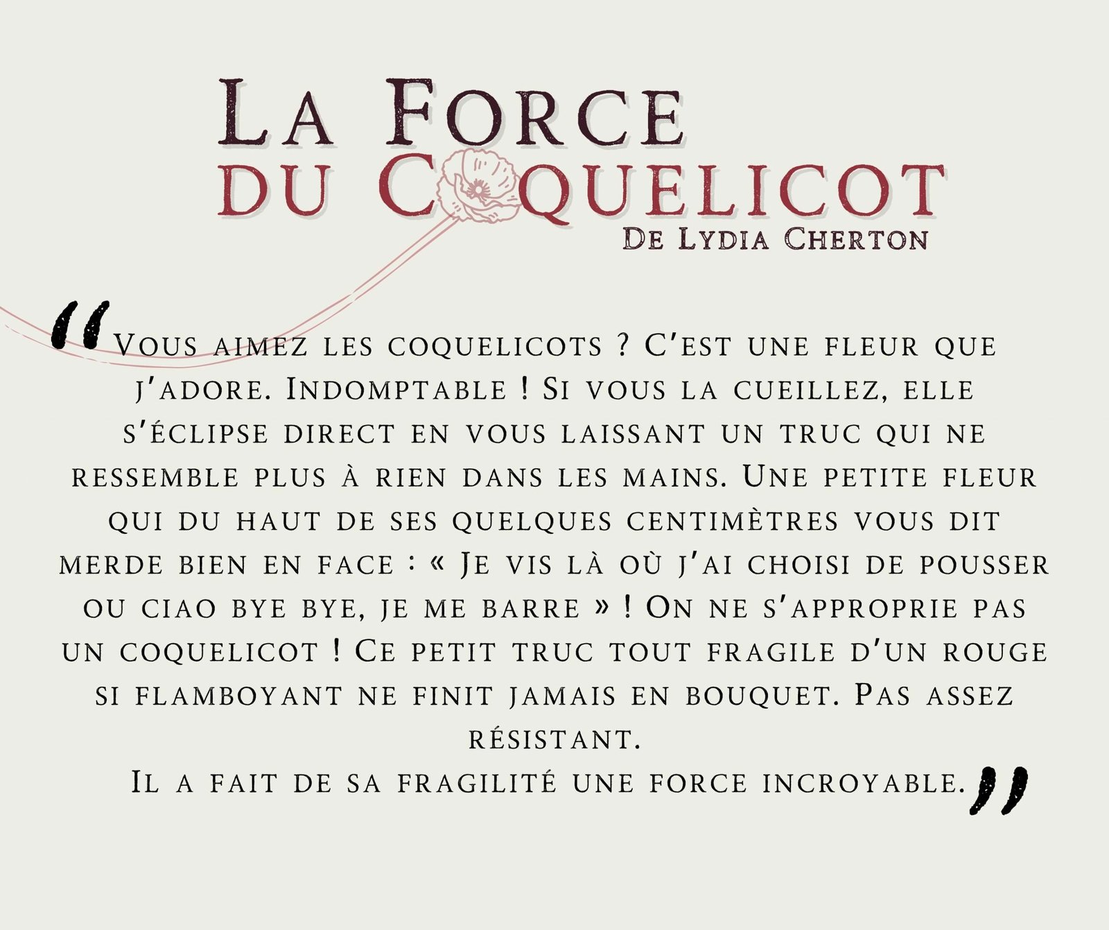 Vous aimez les coquelicots ? C’est une fleur que j’adore. Indomptable ! Si vous la cueillez, elle s’éclipse direct en vous laissant un truc qui ne ressemble plus à rien dans les mains. Une petite fleur qui du haut de ses quelques centimètres vous dit merde bien en face : « Je vis là où j’ai choisi de pousser ou ciao bye bye, je me barre » ! On ne s’approprie pas un coquelicot ! Ce petit truc tout fragile d’un rouge si flamboyant ne finit jamais en bouquet. Pas assez résistant. Il a fait de sa fragilité une force incroyable.