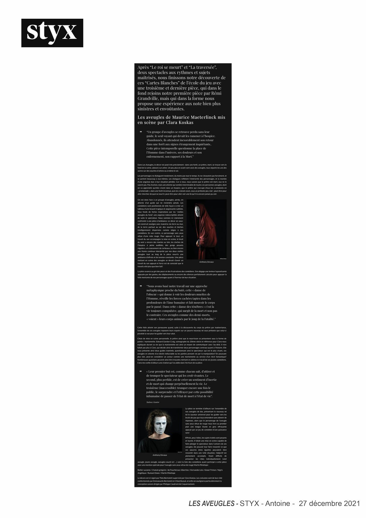 Travail remarquable, précis et parfaitement maîtrisé, Les Aveugles de Clara Koskas constituent une fusion parfaite entre fidélité à l’oeuvre d’origine et modernité des propositions, à travers les emprunts aux techniques du masque, de la marionnette, et du chant. ZONE CRITIQUE