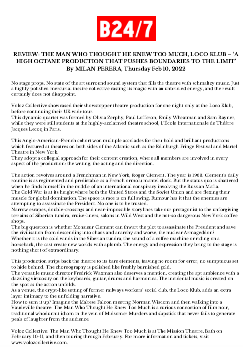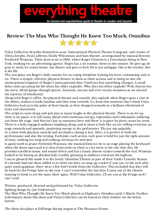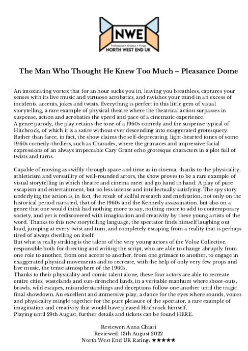 C’est du théâtre physique dans sa forme la plus pure – chaque chute, chaque mime et chaque ligne sont livrés avec précision – créant un monde grand écran. THE SCOTSMAN