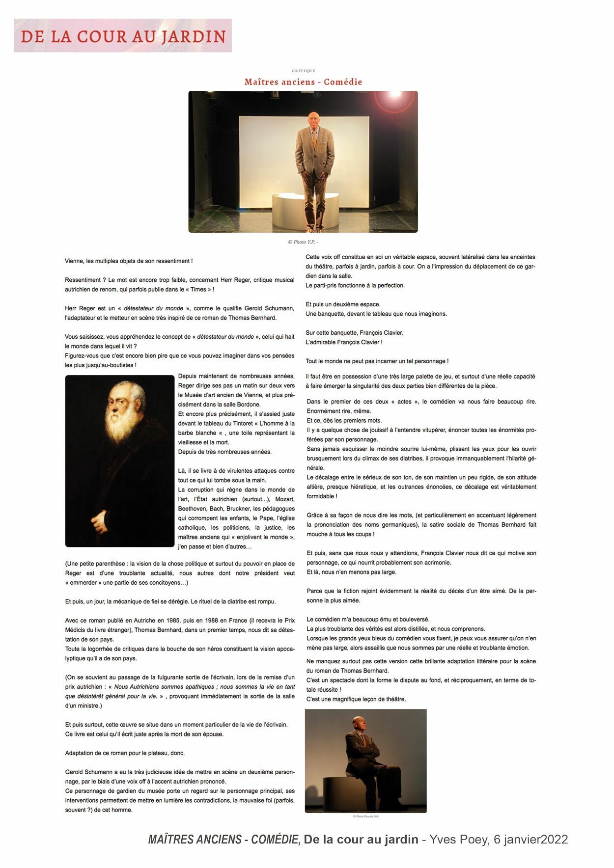 François Clavier donne à entendre, avec finesse et avec une remarquable économie de gestes et expressions, le texte de Thomas Bernhard dans toute sa complexité riche d’ironie, de colère, de drôlerie, de tendresse. LA GRANDE PARADE