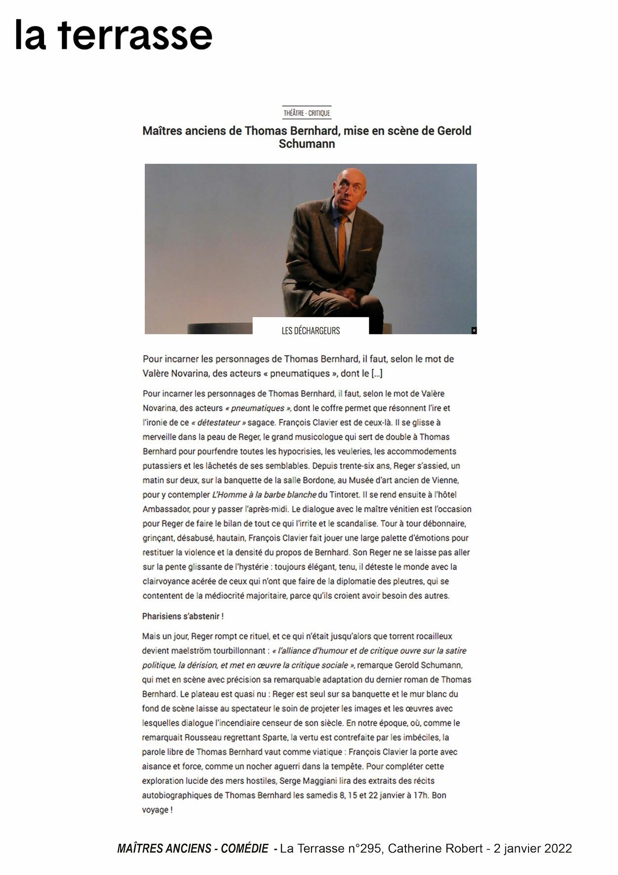 Une remarquable adaptation du dernier roman de Thomas Bernhard que François Clavier porte avec aisance et force. LA TERRASSE