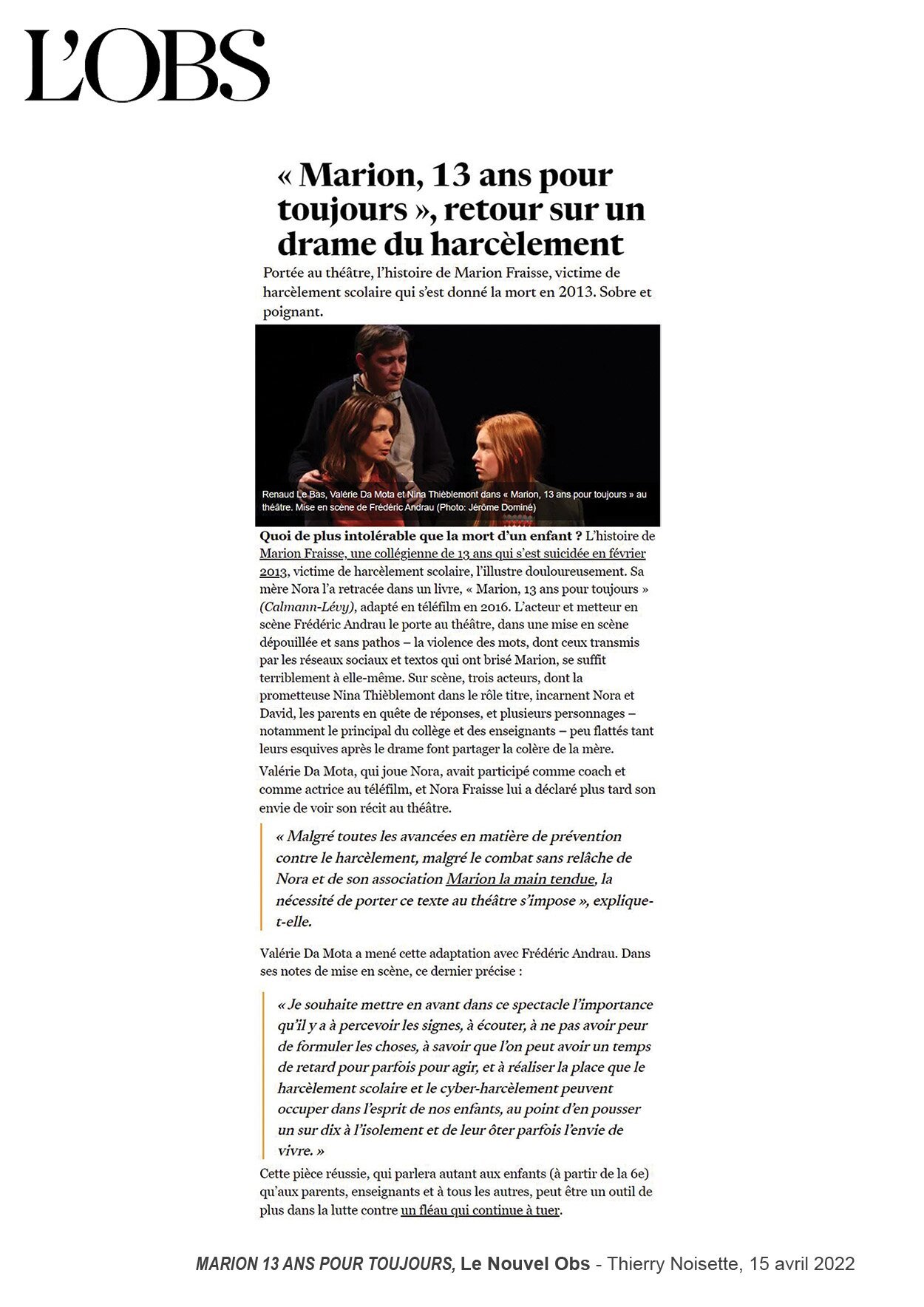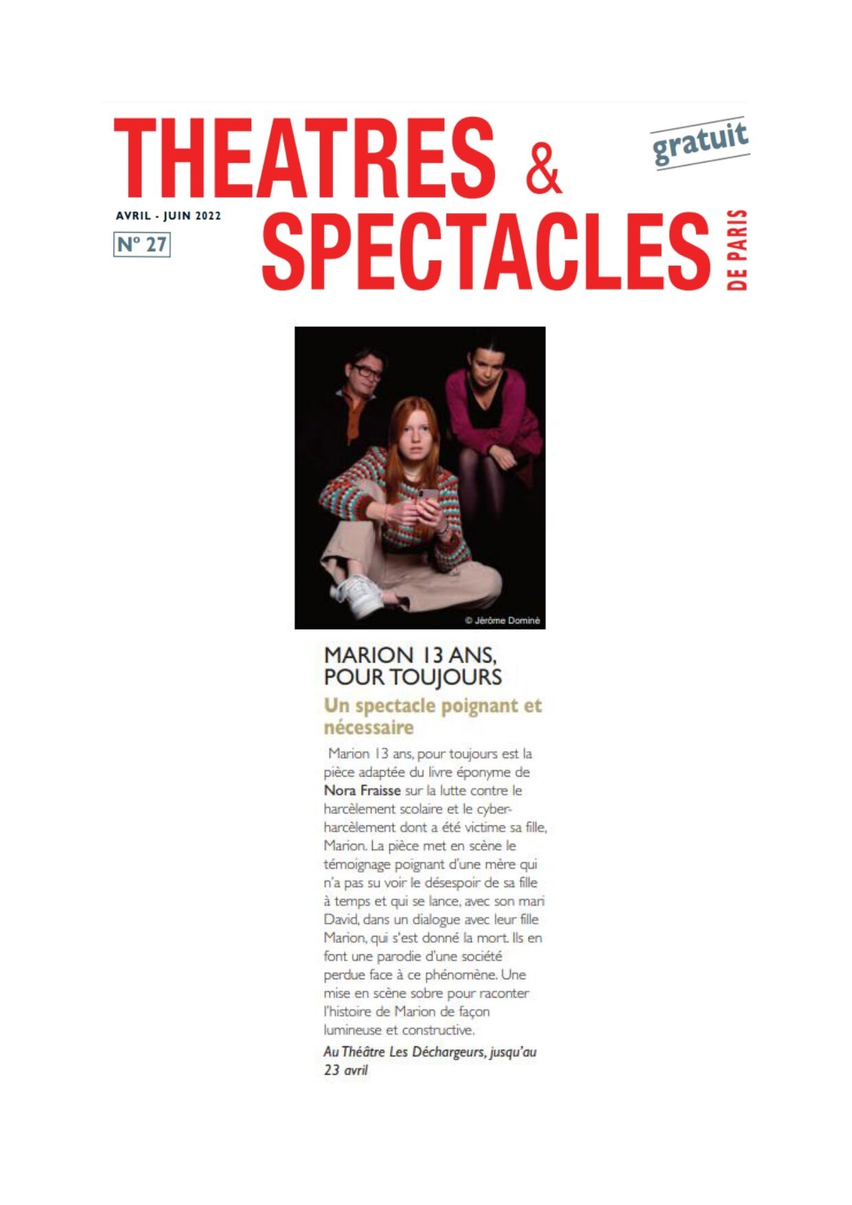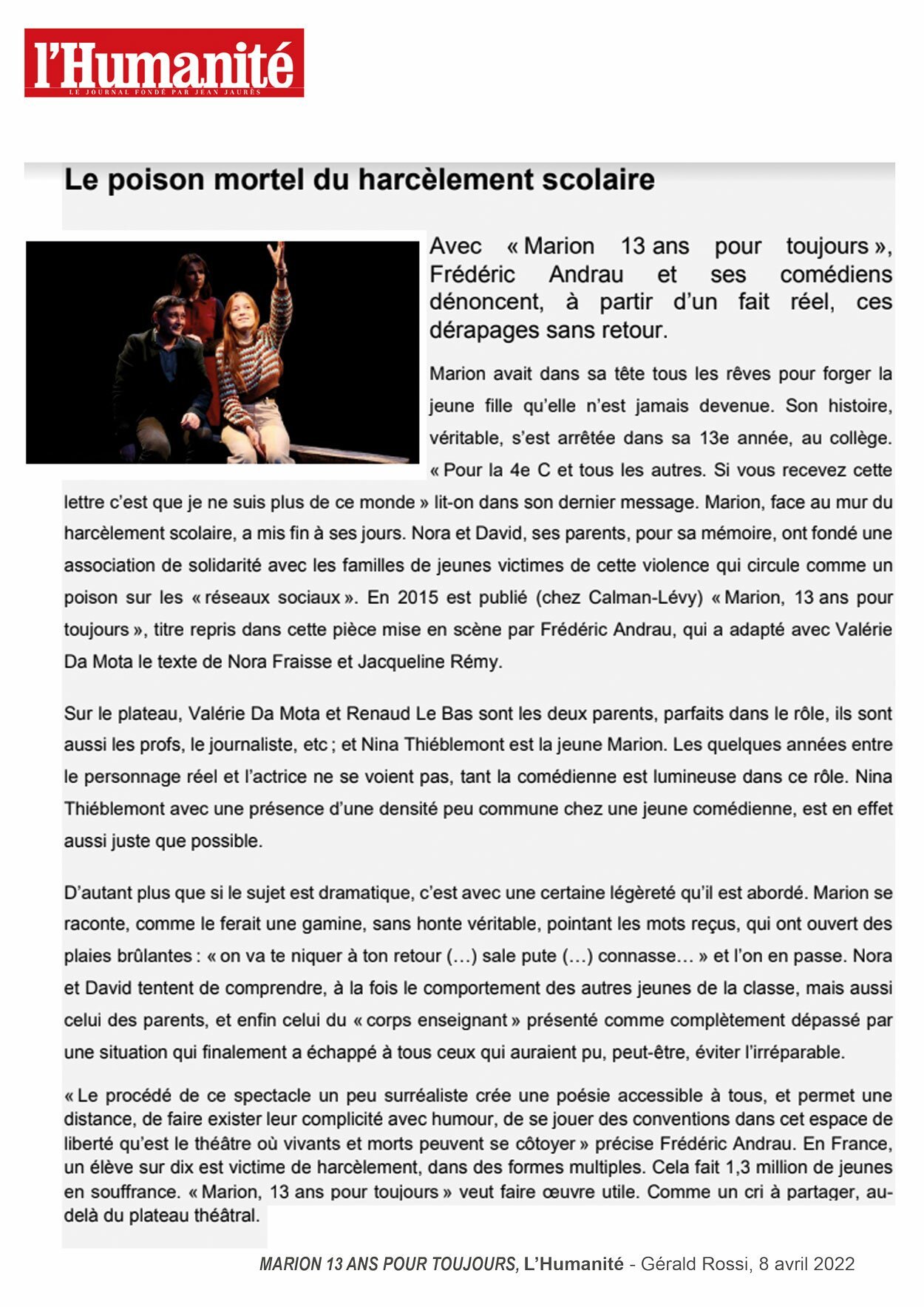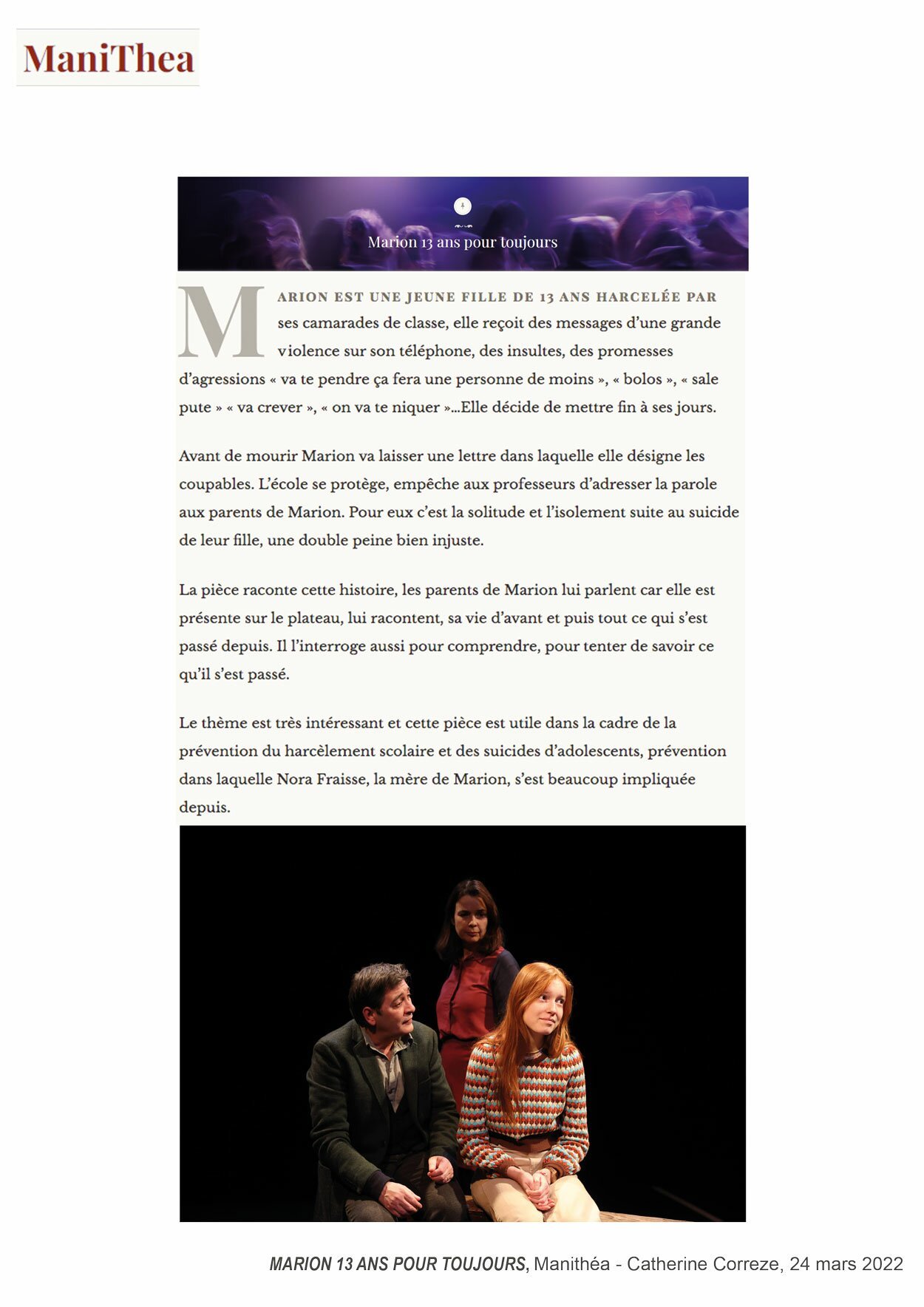 2013. Marion, la fille de Nora Fraisse, est victime d’harcèlement scolaire et de cyber-harcèlement. Nora Fraisse décide d’apporter son témoignage dans un livre « Marion 13 ans pour toujours », qui a été traduit dans une vingtaine de pays. L’histoire de ce succès, ainsi que celui qui a suivi du téléfilm éponyme de Bourlem Guerdjou, avec ses cinq millions de téléspectateurs, reflètent le besoin universel de cette parole. Je suis coach et actrice sur le tournage. 6 ans plus tard, Nora Fraisse me fait part de son envie de voir son récit au théâtre, et que je l’interprète. Malgré toutes les avancées en matière de prévention contre le harcèlement, malgré le combat sans relâche de Nora et de son association Marion la main tendue, la nécessité de porter ce texte au théâtre s’impose. Je me lance dans l’adaptation théâtrale, avec le metteur en scène Frédéric Andrau.