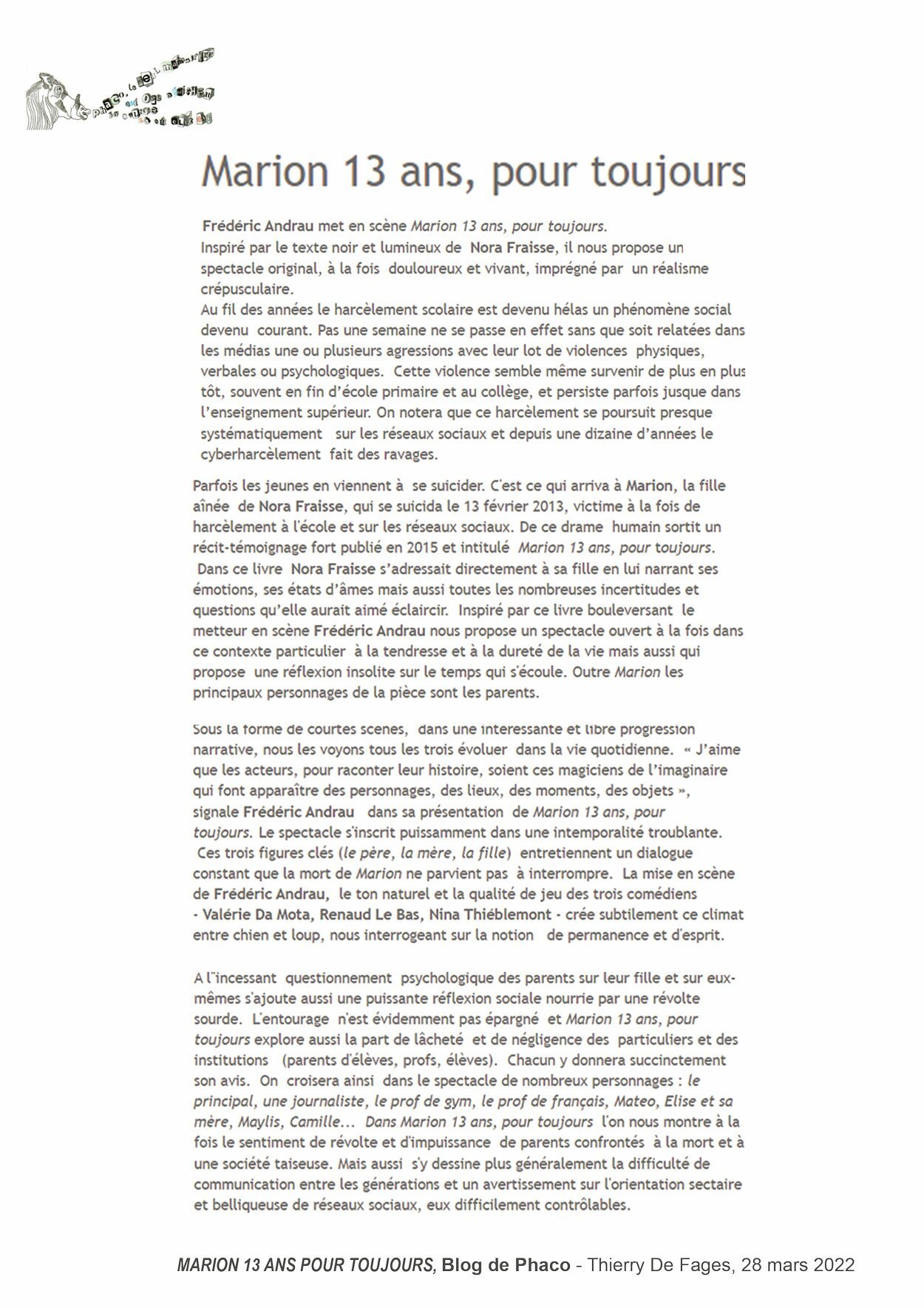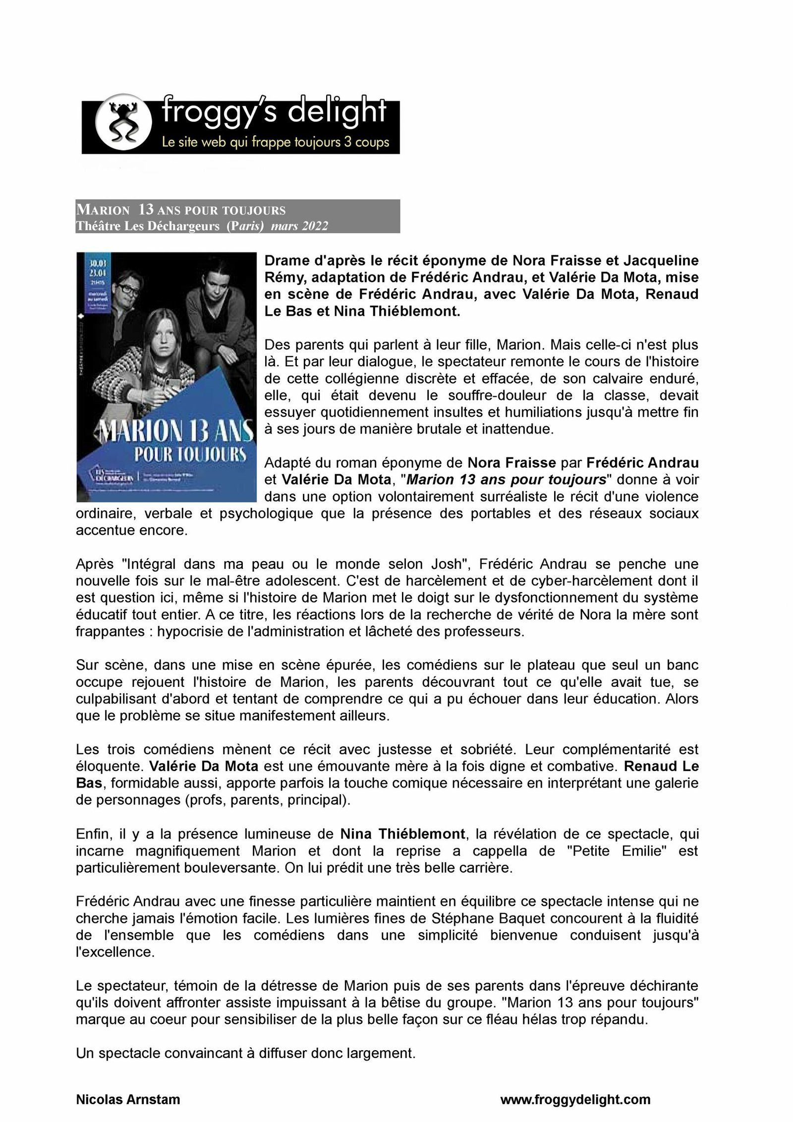 Mon rapport à ce projet est viscéral, très personnel. Après que Valérie Da Mota me l’a proposé, j’ai tout de suite eu le désir de créer des dialogues, de suivre une ligne dramaturgique et de proposer une forme théâtrale en partant du témoignage de Nora Fraisse, le roman Marion 13 ans Pour Toujours. Tout en conservant l’esprit de l’autrice qui s’adresse directement à sa fille, j’ai envie raconter cette histoire de façon lumineuse, constructive en tentant d’apporter comme elle un certain éclairage, et de créer du lien pour rêver ensemble à des solutions. Je souhaite mettre en avant dans ce spectacle l’importance qu’il y a à percevoir les signes, à écouter, à ne pas avoir peur de formuler les choses, à savoir que l’on peut avoir un temps de retard parfois pour agir, et à réaliser la place que le harcèlement scolaire et le cyber-harcèlement peuvent occuper dans l’esprit de nos enfants, au point d’en pousser un sur dix à l’isolement et de leur ôter parfois l’envie de vivre. Frédéric Andrau