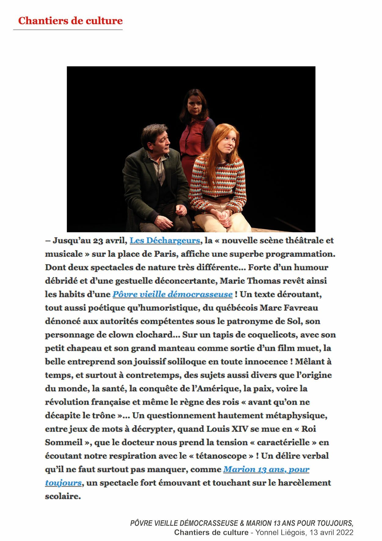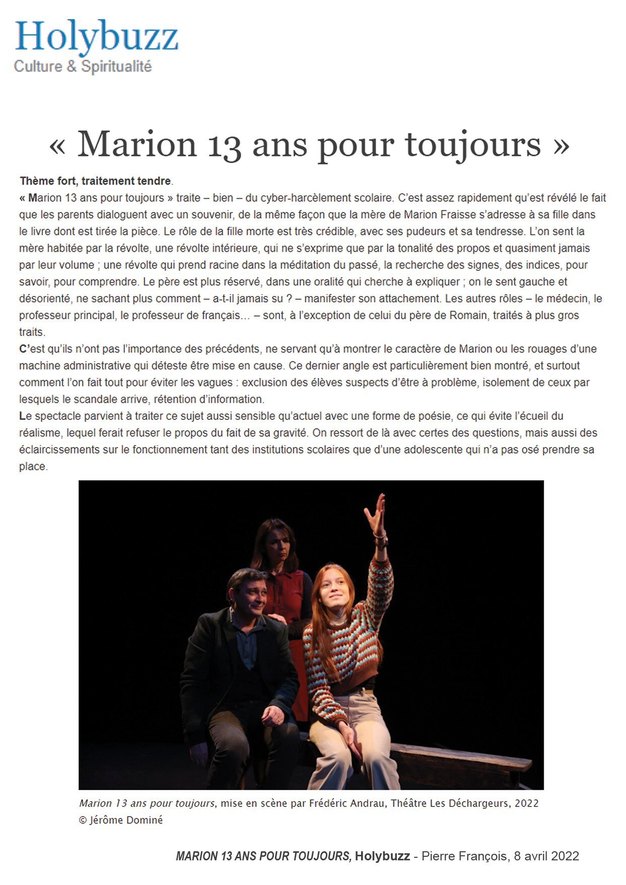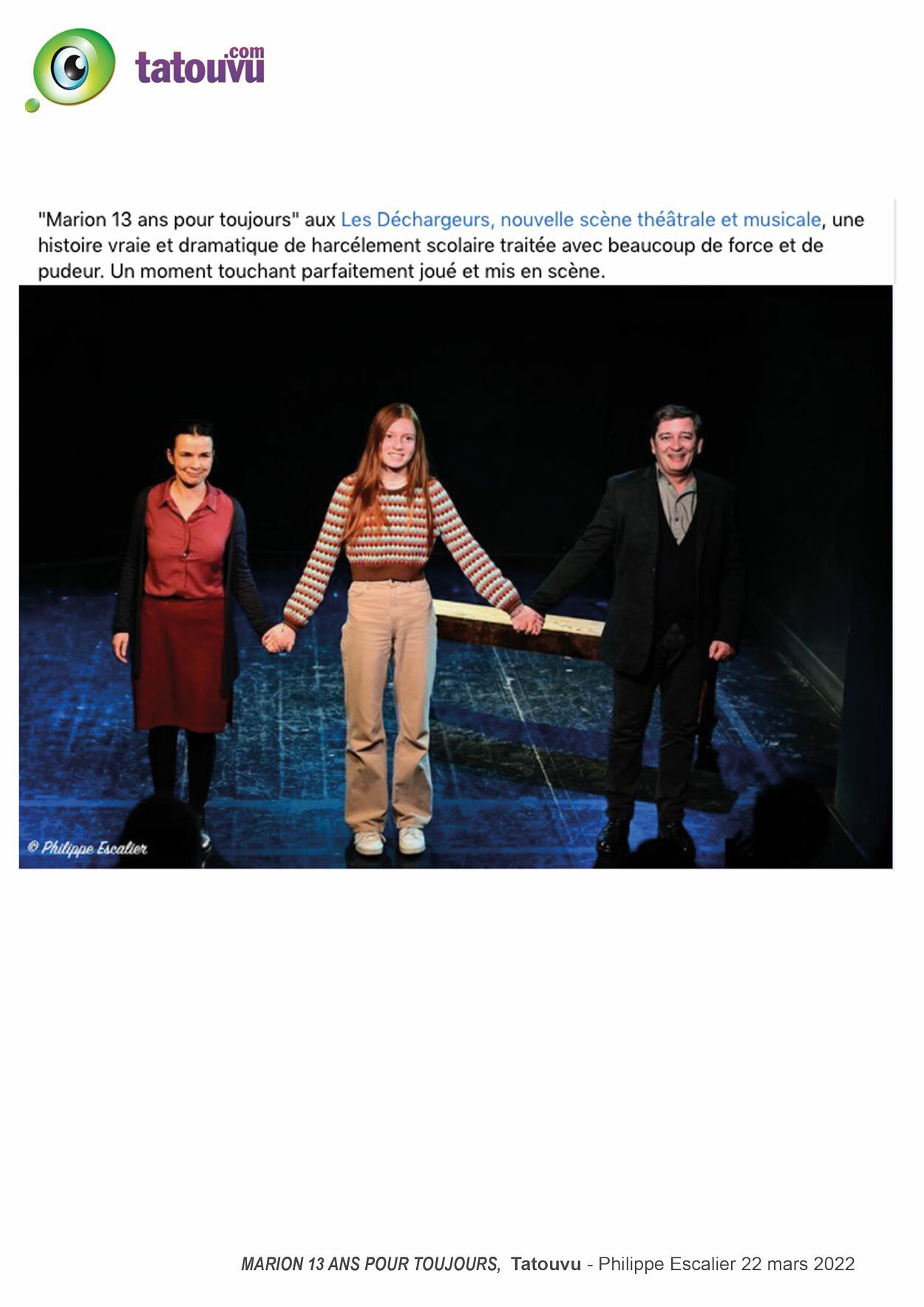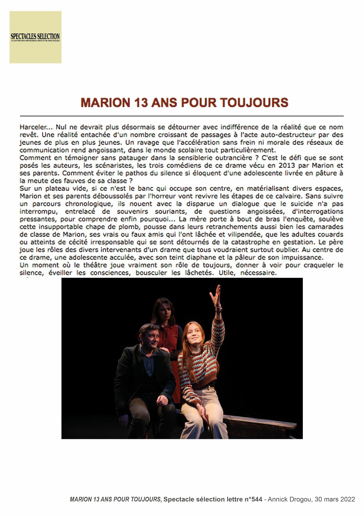 Une mise en scène sobre pour raconter l’histoire de Marion de façon lumineuse et constructive. THÉÂTRES ET SPECTACLES DE PARIS