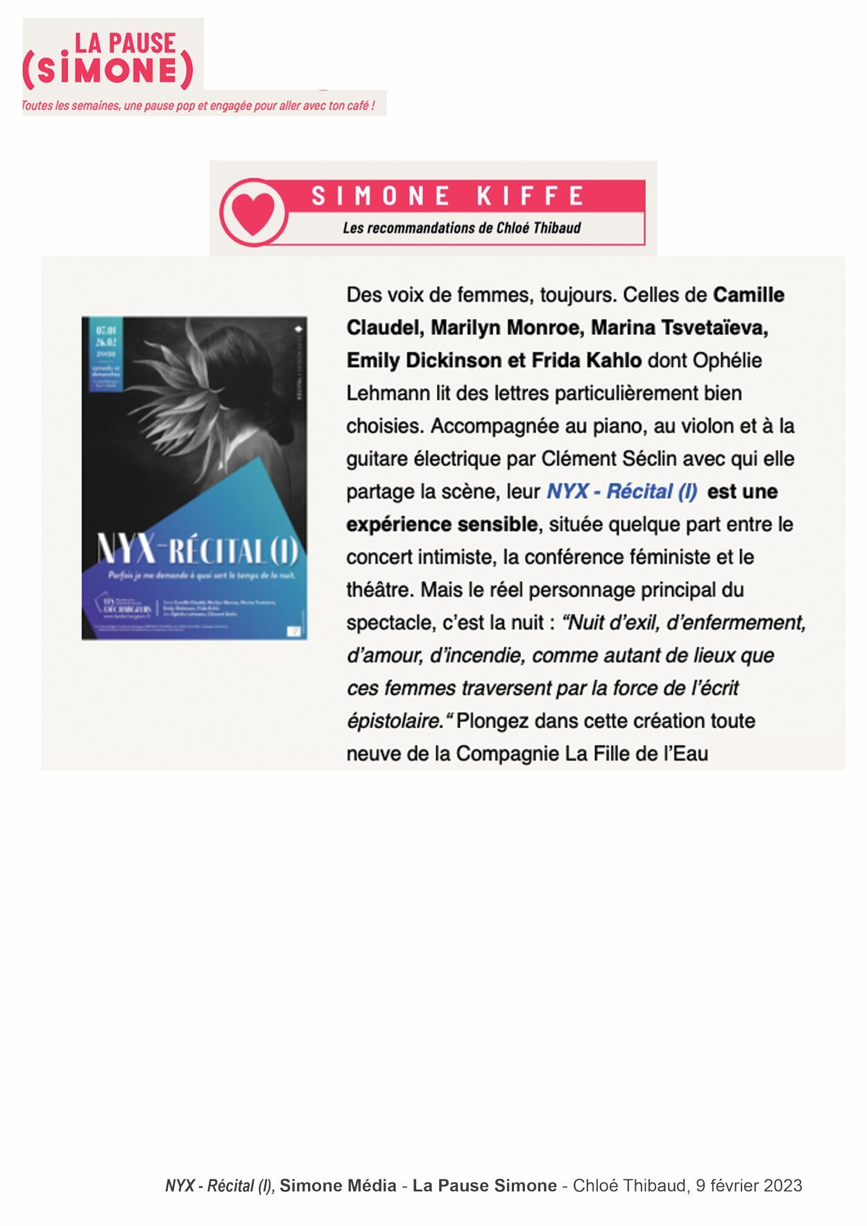 NYX – Récital (I) est une expérience sensible, située quelque part entre le concert intimiste, la conférence féministe et le théâtre. LA PAUSE SIMONE