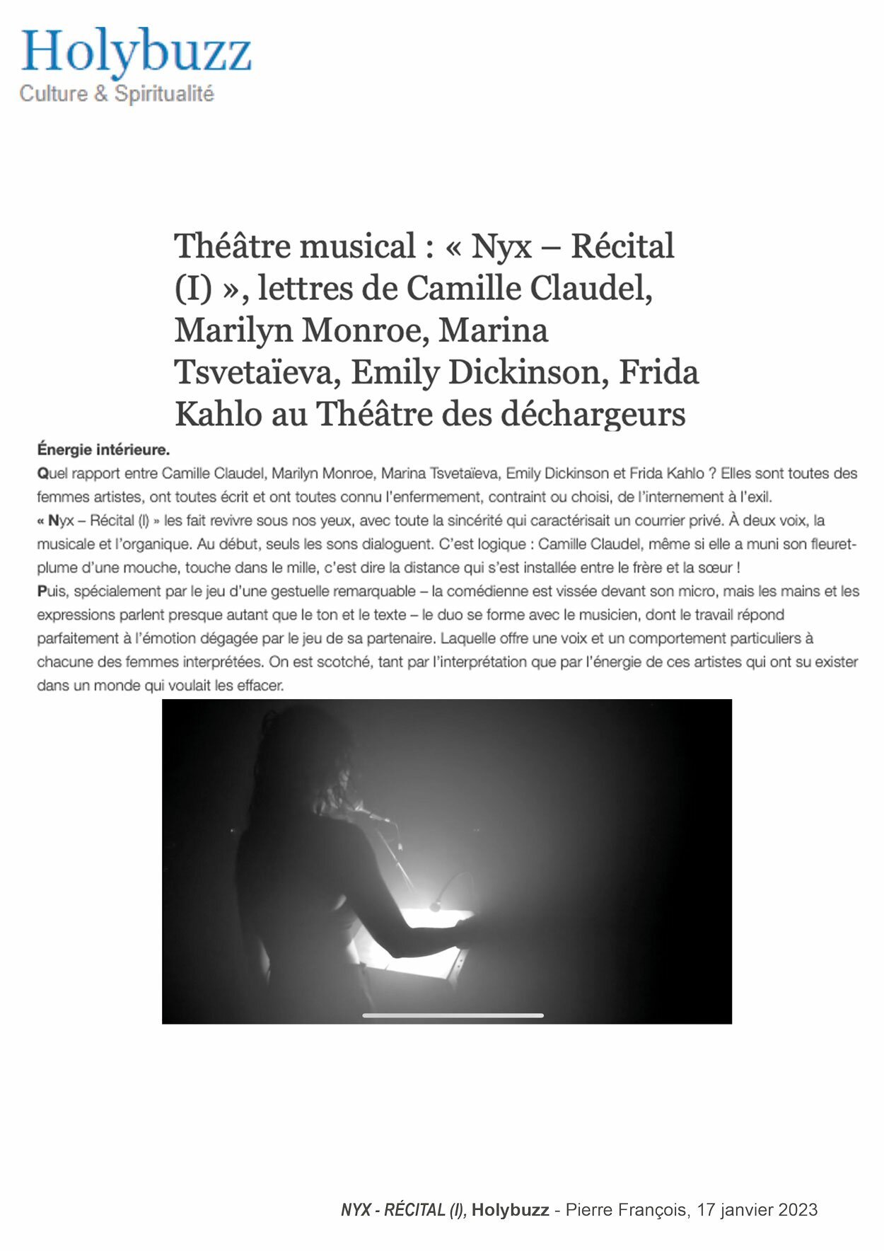 Puis, spécialement par le jeu d’une gestuelle remarquable – la comédienne est vissée devant son micro, mais les mains et les expressions parlent presque autant que le ton et le texte – le duo se forme avec le musicien, dont le travail répond parfaitement à l’émotion dégagée par le jeu de sa partenaire. Laquelle offre une voix et un comportement particuliers à chacune des femmes interprétées. On est scotché, tant par l’interprétation que par l’énergie de ces artistes qui ont su exister dans un monde qui voulait les effacer. HOLY BUZZ