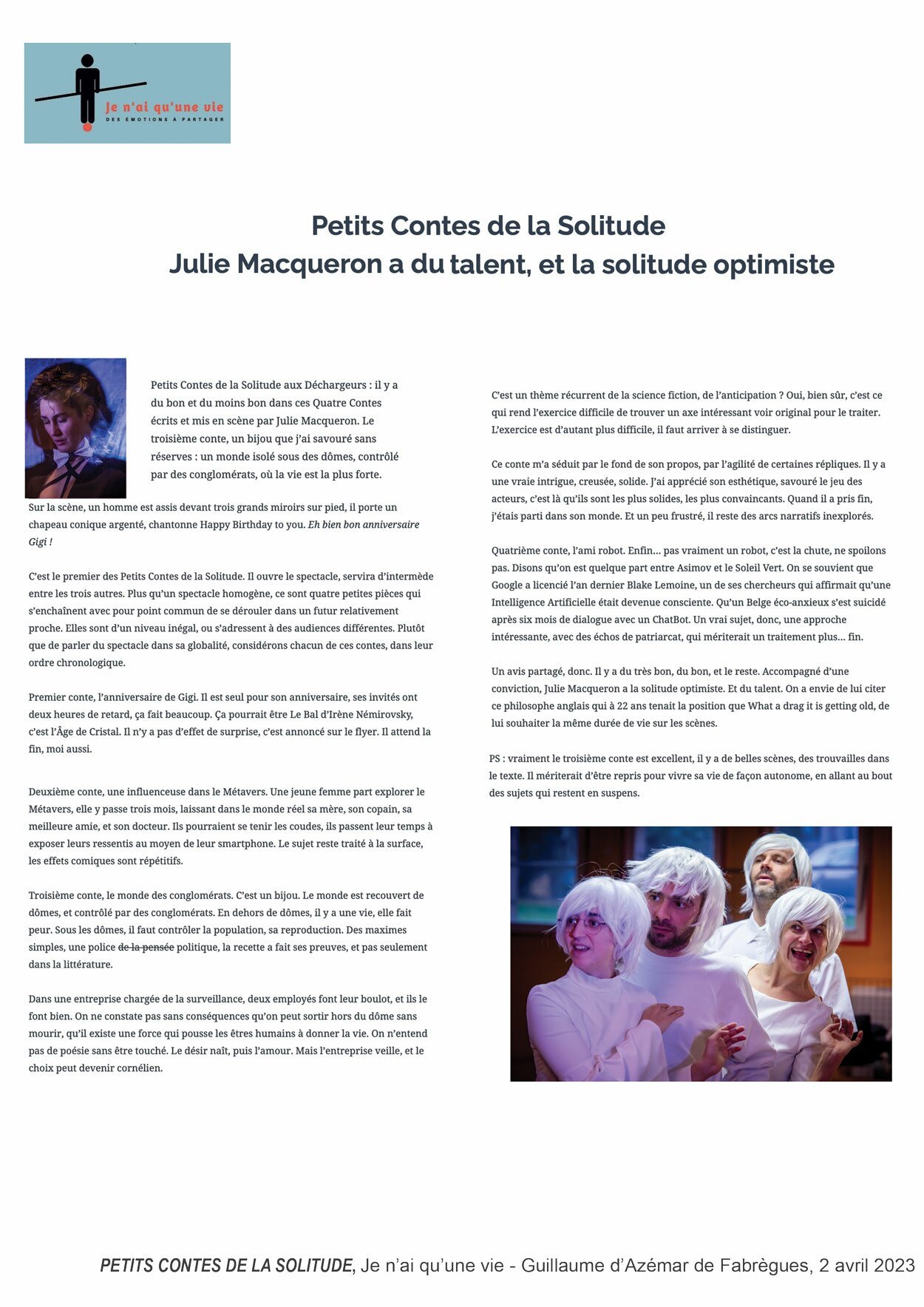 Julie Macqueron a du talent. Le troisième conte que j’ai savouré sans réserve est un bijou. JE N’AI QU’UNE VIE