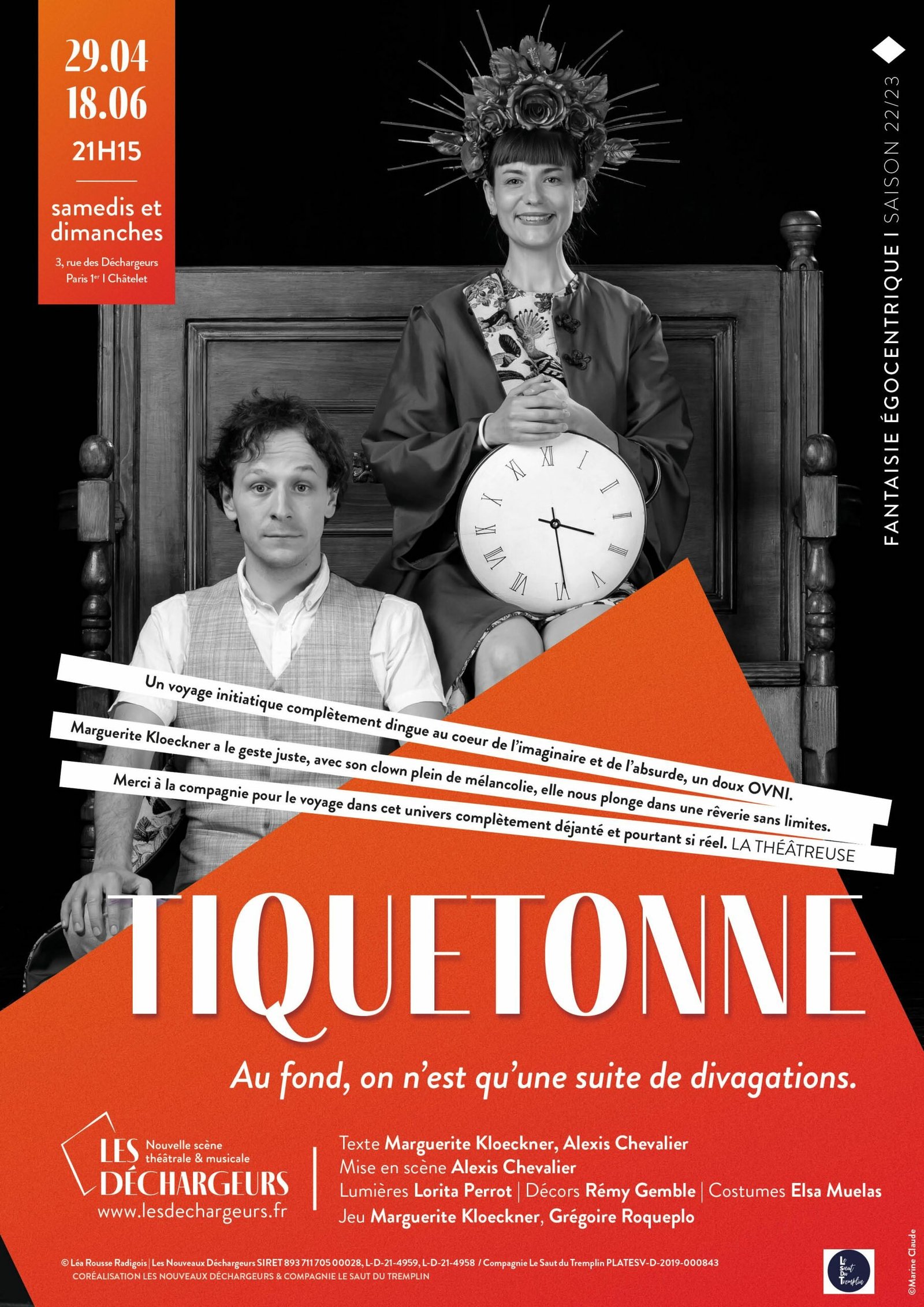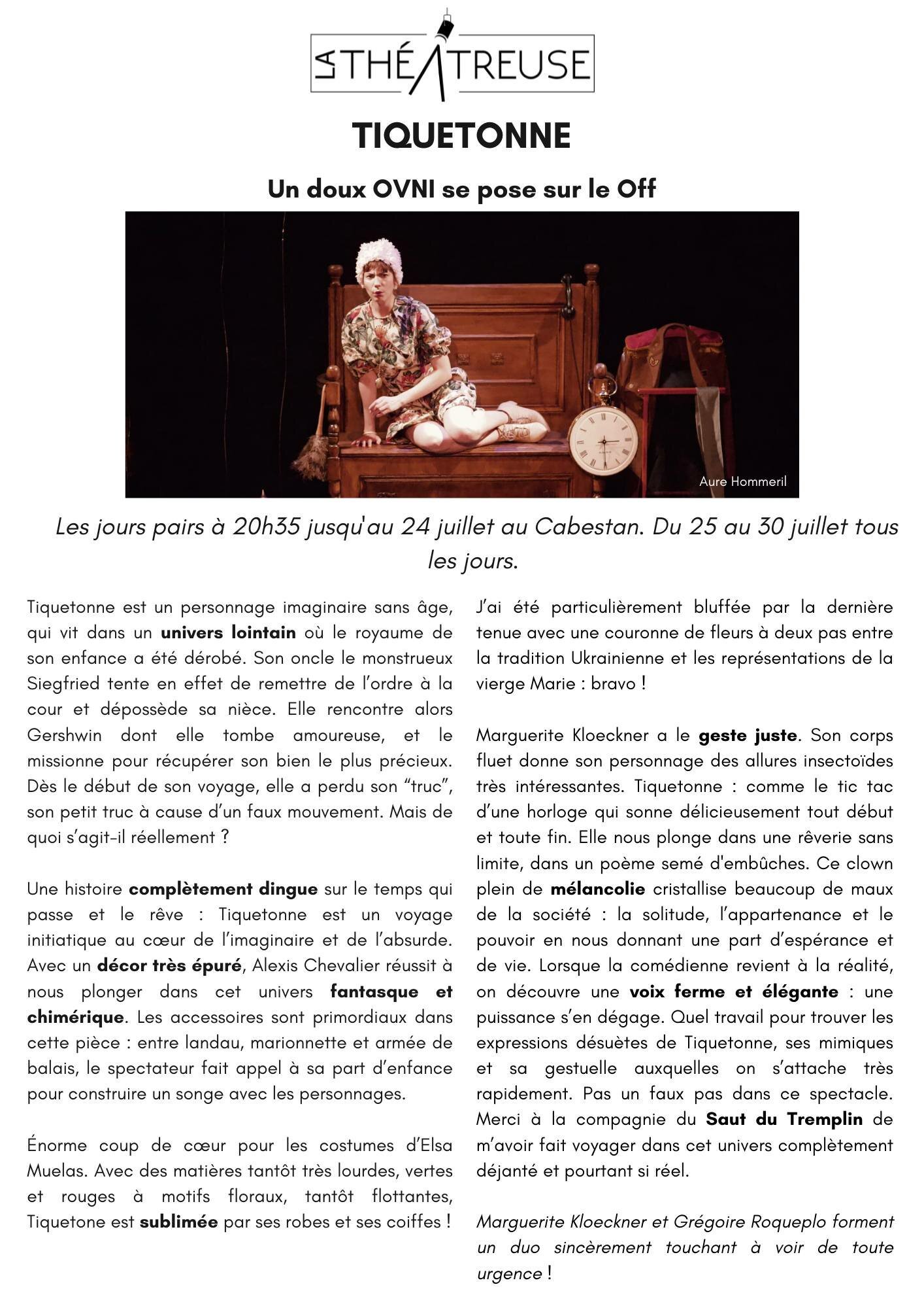Née dans l’esprit de Marguerite Kloeckner et Alexis Chevalier, Tiquetonne déploie un imaginaire aux confins de l’absurde, voire de la folie douce, qui nécessite parfois de s’accrocher, mais la performance scénique de la première et la mise en scène pleine d’inventivité du second apportent juste ce qu’il faut de poésie échevelée, capable, le temps d’une heure, de transporter dans un autre univers. TT/TÉLÉRAMA