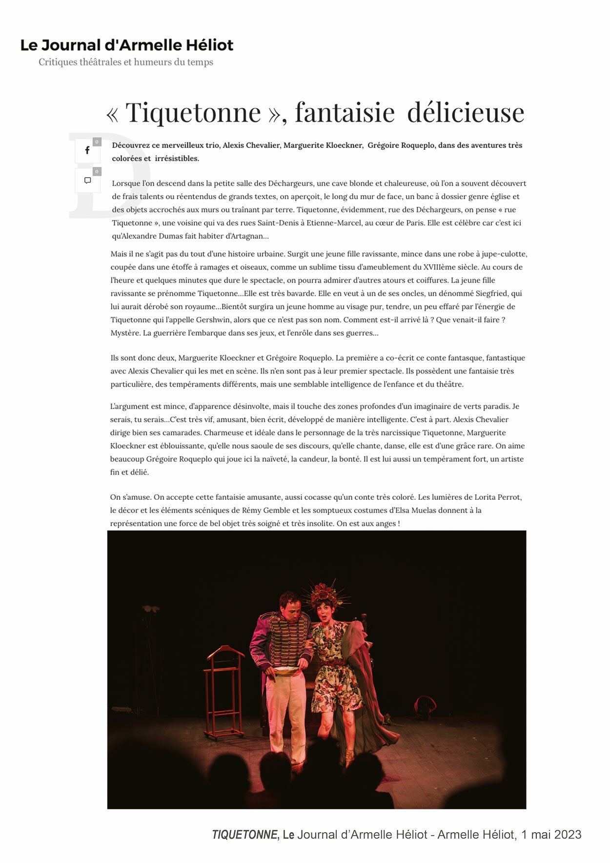 Un bel objet très soigné et très insolite. On est aux anges ! C’est très vif, amusant, bien écrit, développé de manière intelligente. C’est à part. Alexis Chevalier dirige bien ses camarades. Marguerite Kloeckner est éblouissante, qu’elle nous saoule de ses discours, qu’elle chante, danse, elle est d’une grâce rare. On aime beaucoup Grégoire Roqueplo qui joue ici la naïveté, la candeur, la bonté. Il est lui aussi un tempérament fort, un artiste fin et délié. LE JOURNAL D’ARMELLE HÉLIOT
